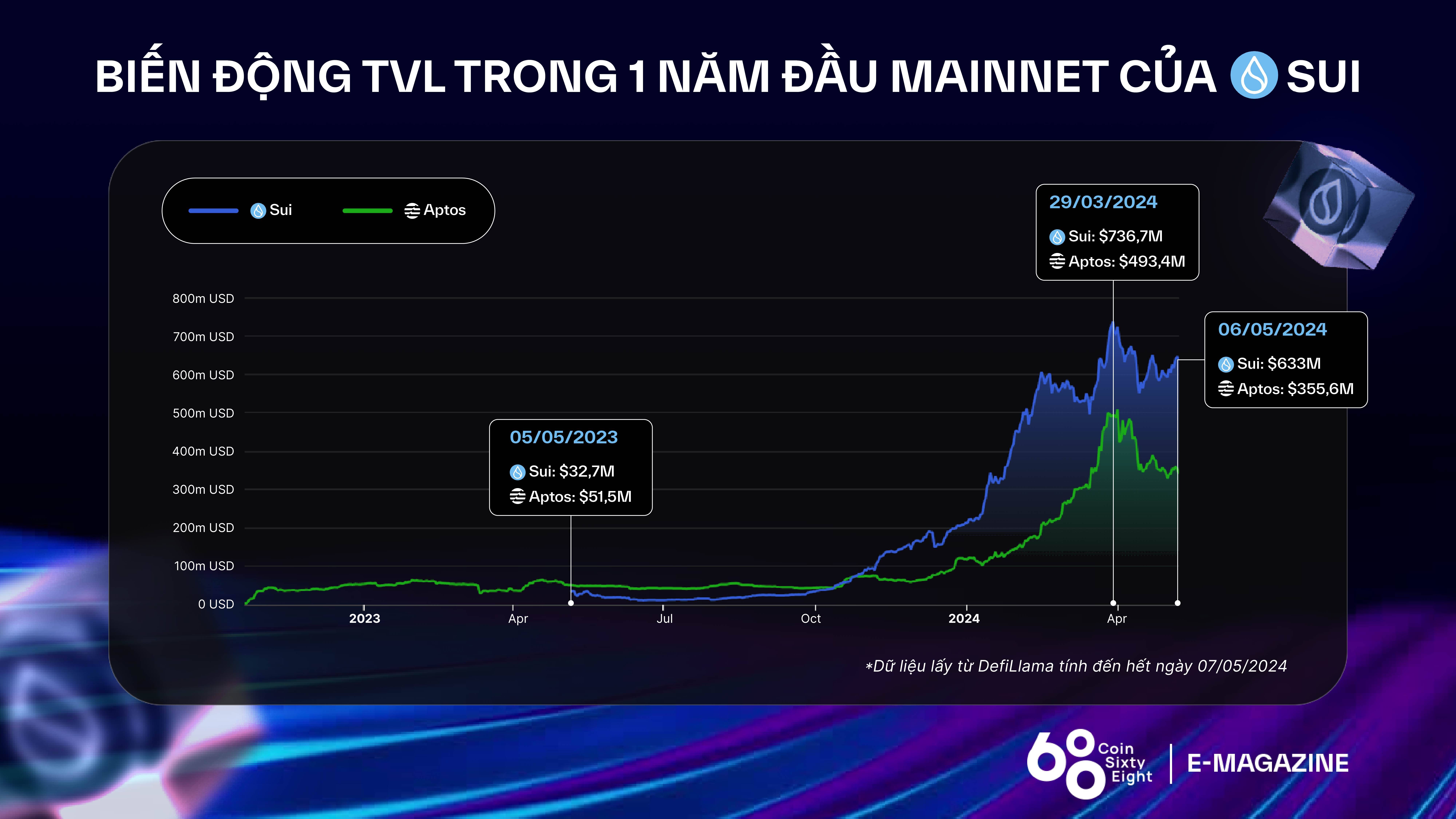 Giữa một loạt FUD bủa vây, Sui ra mắt vào ngày 03/05/2023. Khi đó TVL của Sui là 32,7 triệu USD, Aptos là 51,5 triệu USD.
