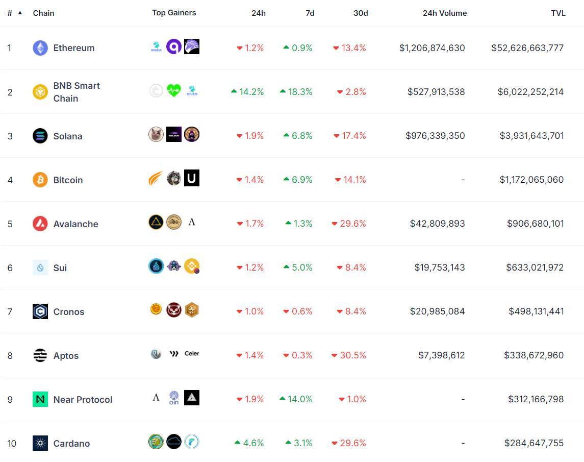 Mức TVL này chưa đủ sức đưa Sui vào “câu lạc bộ tỷ đô”, nhưng cũng giúp dự án đứng thứ 6 trong hàng ngũ các Layer-1 hiện nay. Trước Sui lần lượt là Bitcoin, Ethereum, BNB Chain, Solana, và Avalanche – đều là những blockchain nền tảng lâu đời.