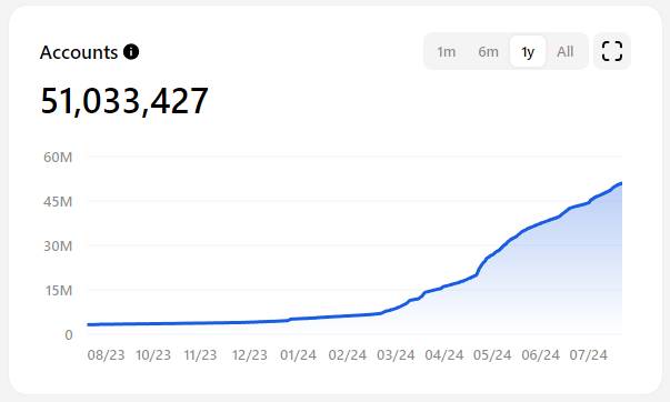 Với những mối liên hệ mật thiết và sự tích hợp độc quyền vào Telegram thì TON Blockchain đang là mạng lưới hứng sóng tốt nhất. Các chỉ số on-chain của mạng lưới liên tục dựng cột và tạo ATH mới. Từ đầu năm 2024, lượng người dùng của TON tăng gấp 11 lần từ 4,3 triệu lên 51 triệu. Có những giai đoạn số lượng giao dịch trên mạng lưới cán mốc 9 triệu giao dịch/ngày, gấp 50 lần so với giai đoạn trước đây.