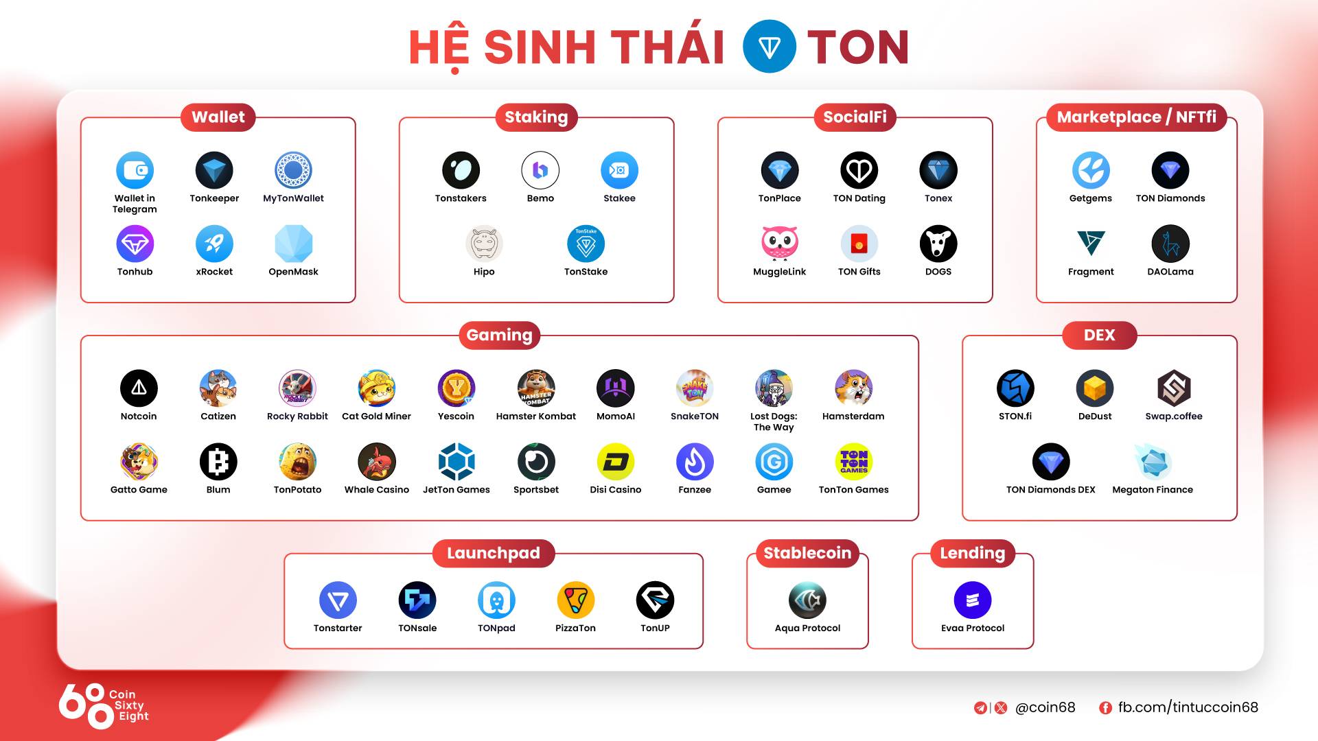 Hệ sinh thái TON ở giai đoạn hiện tại ngoài mảng cơ sở hạ tầng phục vụ các nhu cầu cơ bản thì Telegram Games đang là nhóm dành được nhiều sự quan tâm nhất. Theo thống kê từ TONApp có tổng cộng 1.109 dapp được triển khai trên TON Blockchain, dưới đây là danh sách các danh mục lớn và dự án nổi bật trong từng nhóm.