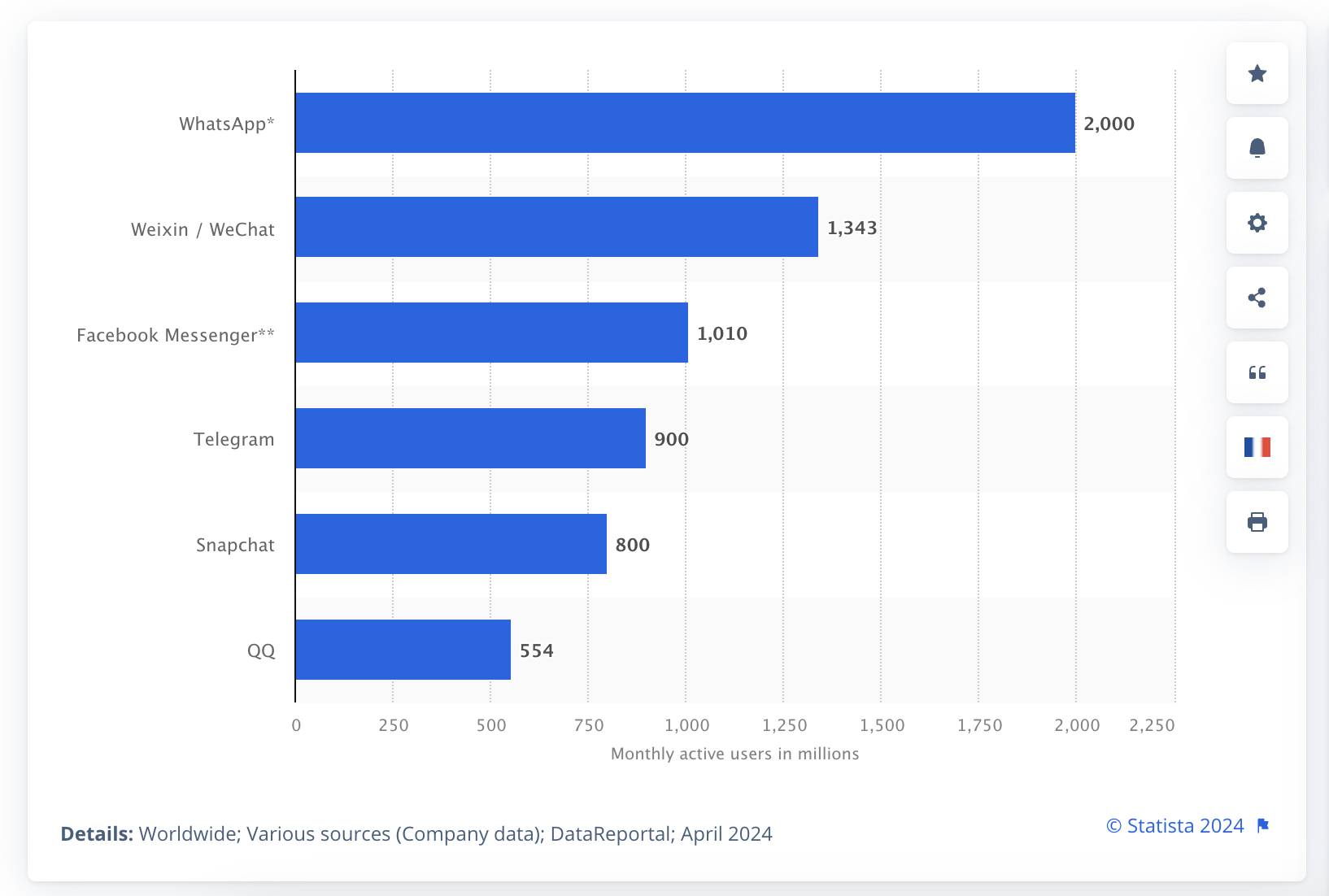 Top các ứng dụng nhắn tin phổ biến toàn cầu. Nguồn: Statistics, ngày 21/08/2024