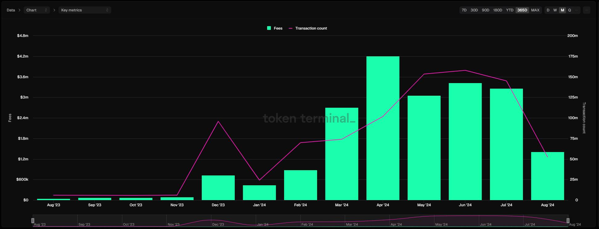 Số lượng giao dịch và gas fee mạng lưới TON. Nguồn: TokenTerminal, ngày 21/08/2024