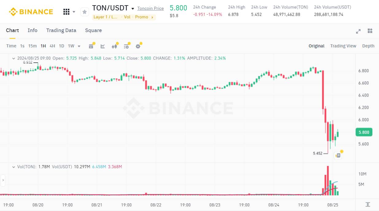 Đồ thị 1h của cặp TON/USDT trên sàn Binance vào 09:25 AM ngày 25/08/2024
