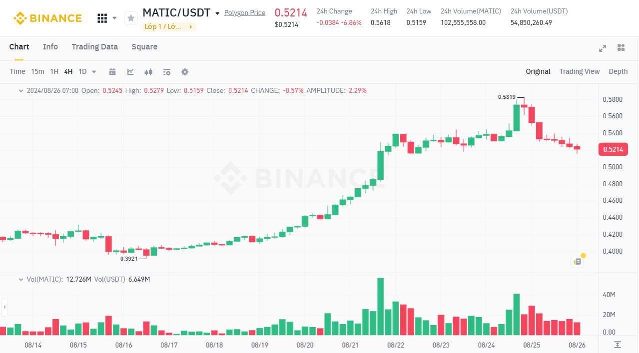 Đồ thị 4h của cặp MATIC/USDT trên sàn Binance vào 09:50 AM ngày 26/08/2024