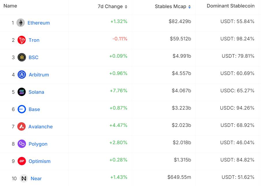 Thống kê về nguồn cung lưu thông của stablecoin trên các blockchain layer-1. Nguồn: DefiLlama (23/08/2024)