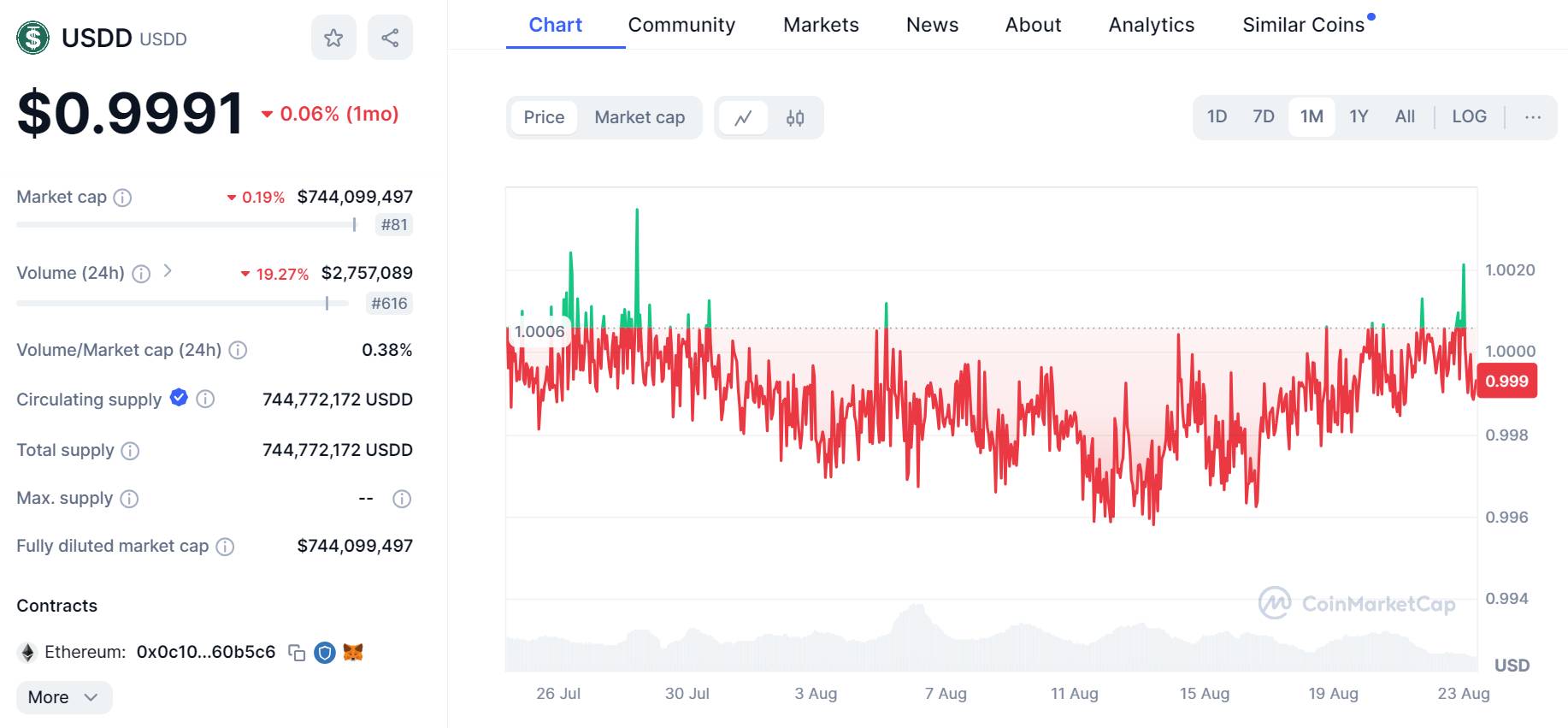 Biến động giá USDD trong 1 tháng gần nhất, ảnh chụp màn hình CoinMarketCap vào 09:50 AM ngày 23/08/2024