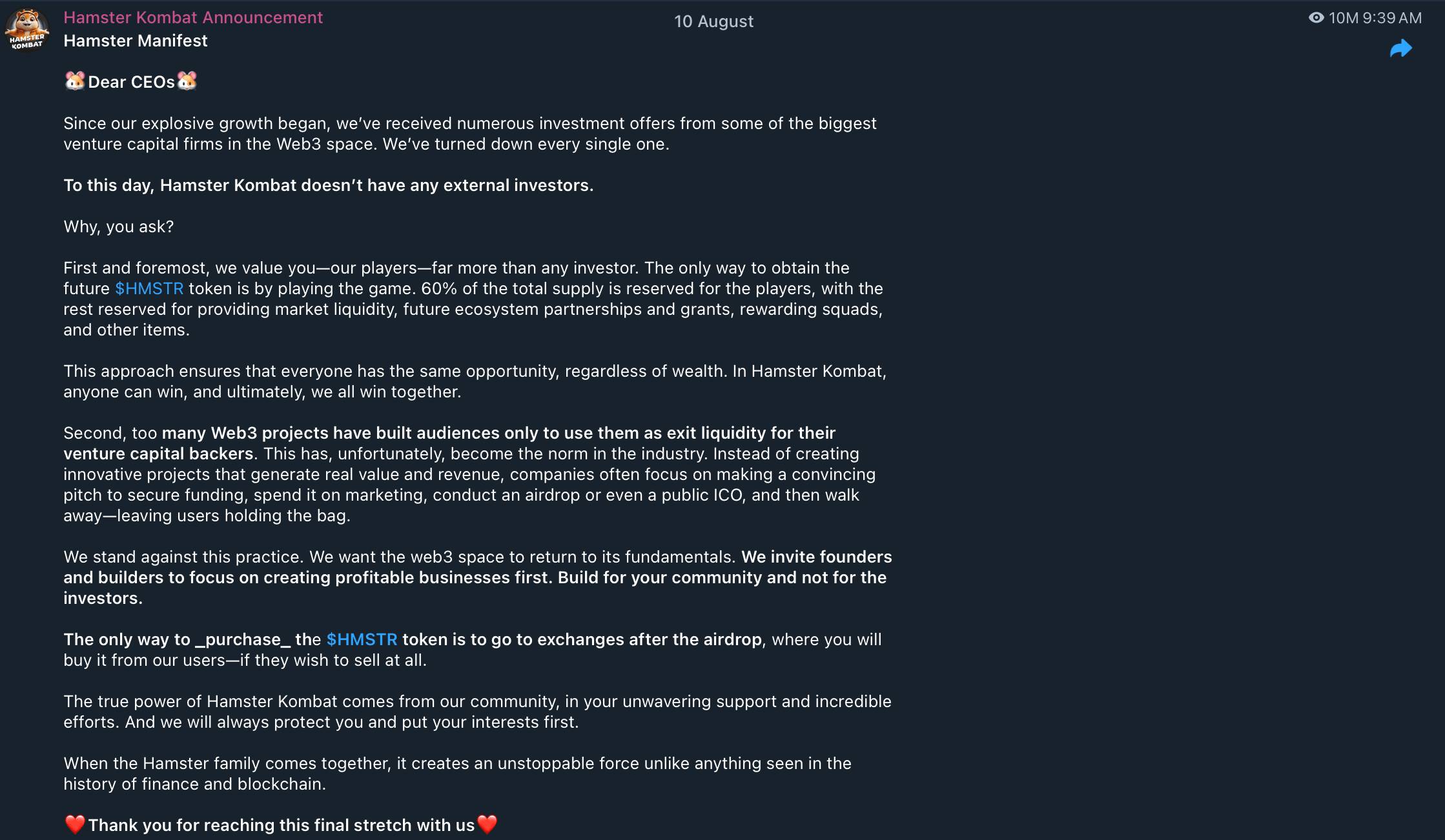 Hamster Kombat cho biết đã nhận được nhiều lời đề nghị rót vốn từ các quỹ đầu tư đầu ngành, nhưng đã từ chối tất cả để duy trì một tựa game đích thực cho người chơi của mình. Dự án tuyên bố HMSTR sẽ là đợt airdrop lớn nhất lịch sử.